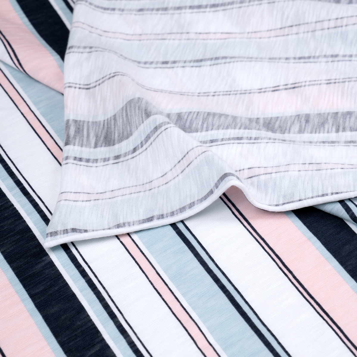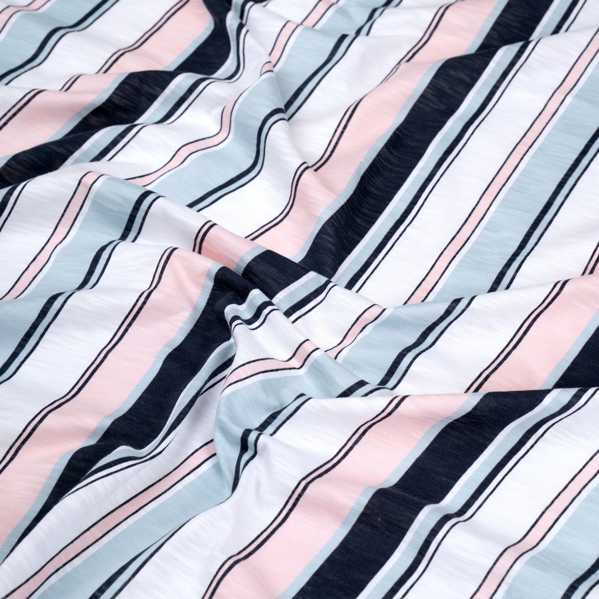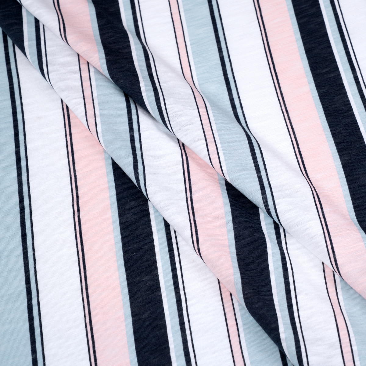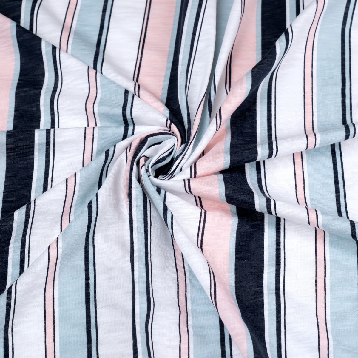 Тонкий и гладкий хлопковый трикотаж имеет штриховой эффект на полотне, чем и создается эффект разных тонов. Выраженные штрихи придают полотну свежесть, яркость и привлекают внимание.
